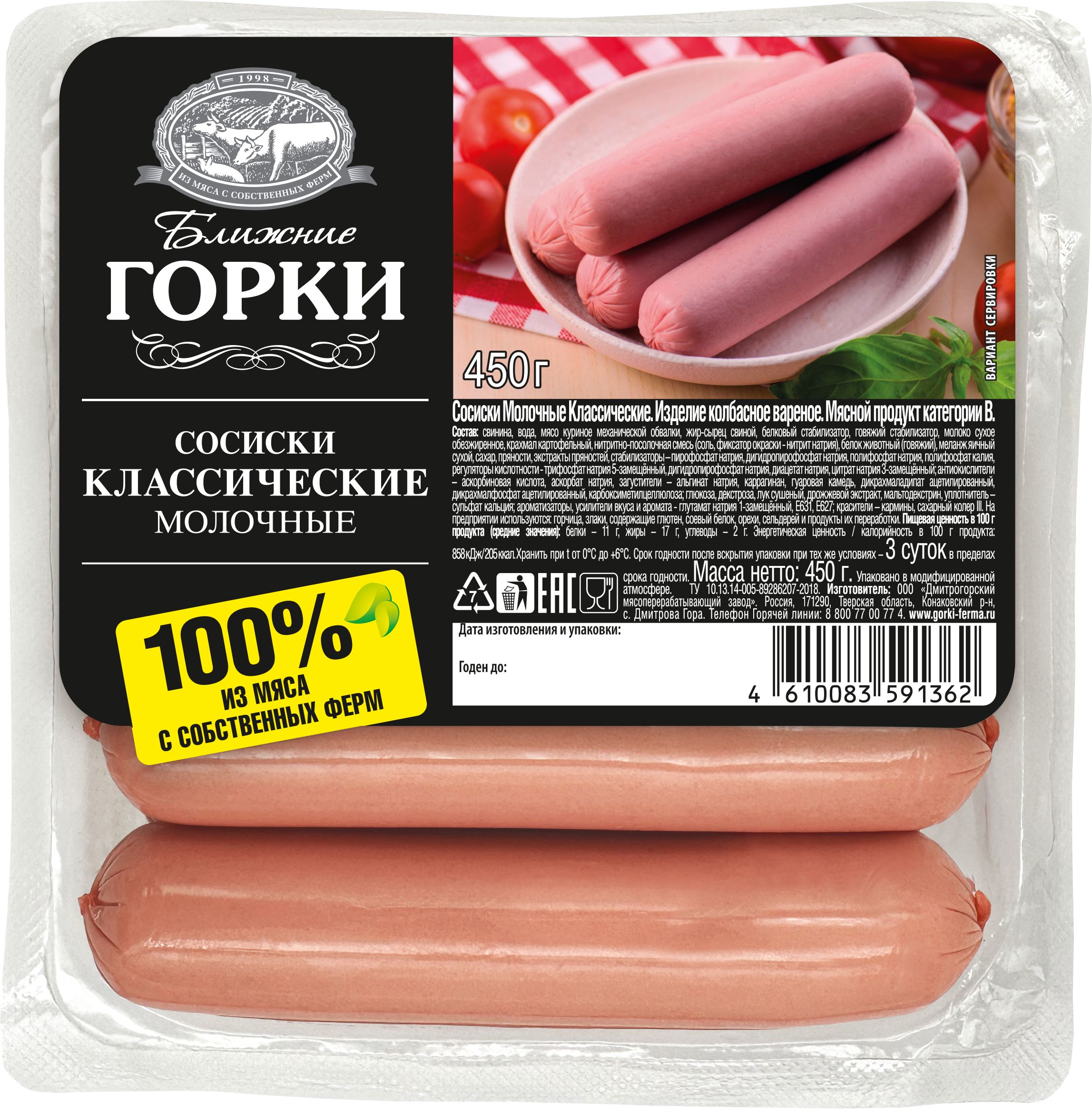 Молочные Классические сосиски в п/о 450г, газ "Ближние Горки"/6шт/(Дмитрогорский МЗ)